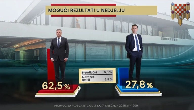 A 2024. december 29-i horvátországi elnökválasztás első fordulójában a hivatalban lévő Zoran Milanovic a szavazatok 49,09 százalékát szerezte meg, ami mindössze 0,91 százalékponttal maradt el a teljes győzelemtől. A második fordulót január 12-én, vasárnap tartják.